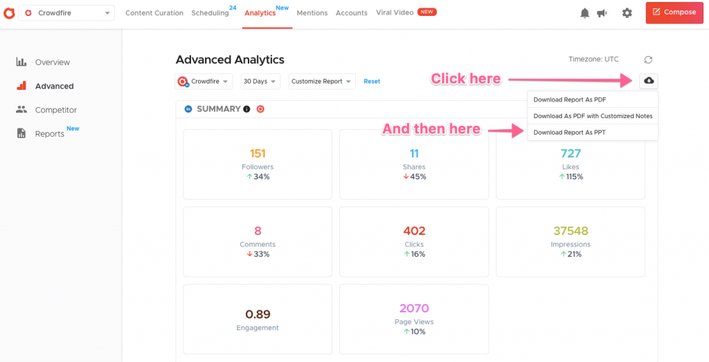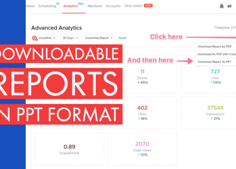 A little background – At Crowdfire, we used to make presentations for our monthly stand-ups and this reporting consisted of PPTs with ALL the important data. We understood that analysing all the numbers, downloading different reports, adding it all to a custom report and then creating a presentation is a lot of work. So we decided to make it simple for everyone out here. We started with Advanced analytics, data comparison, PDF downloads and are happy to announce that now you can download PPT reports for all your Social networks, directly from Crowdfire.