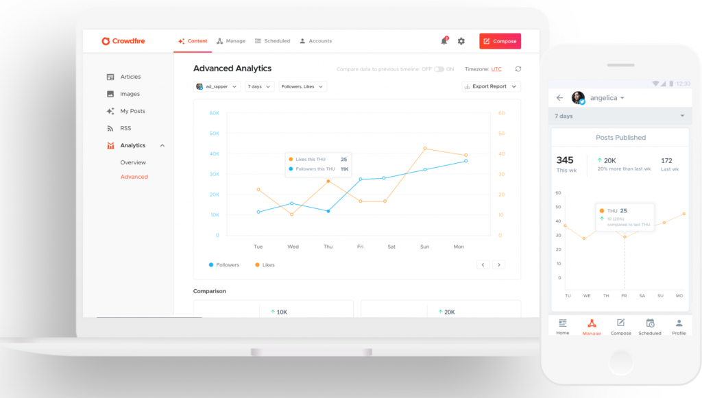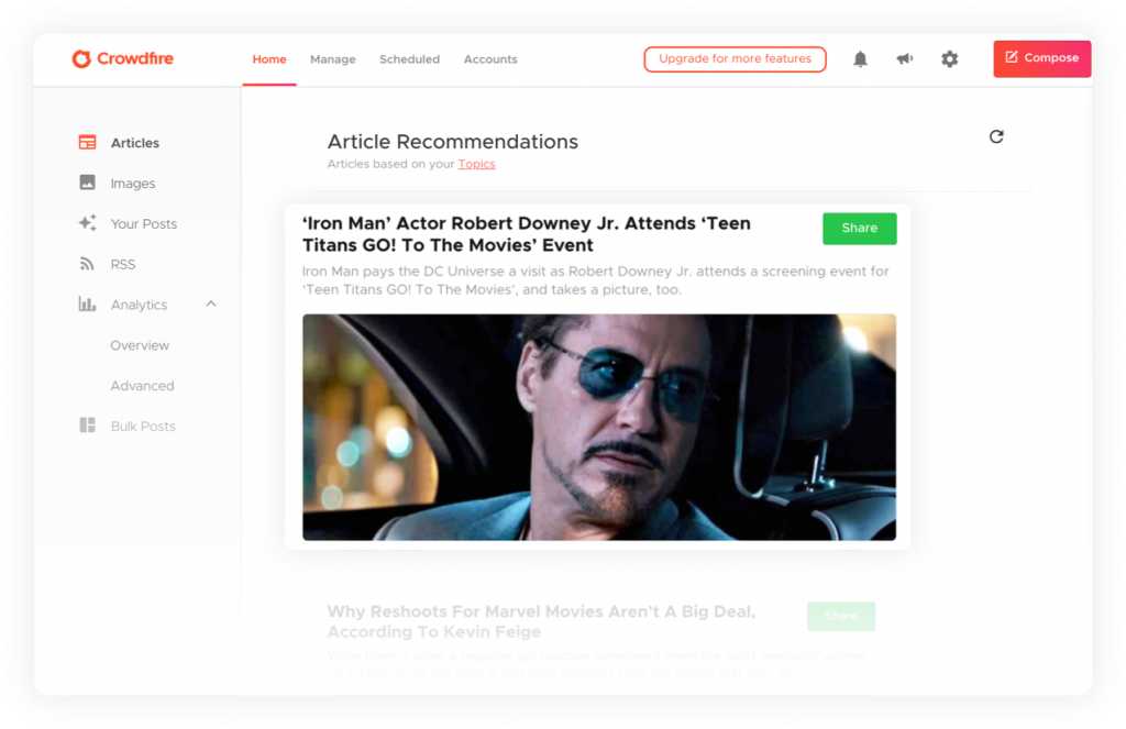 With Crowdfire, you can find curated content, schedule your posts, engage with your audience, deep-dive into analytics and create custom reports. Try it for free.