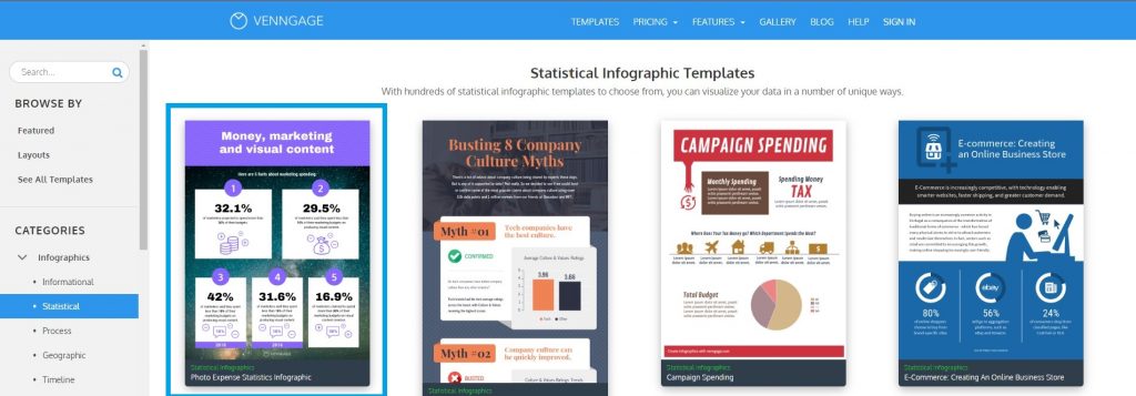 When you visit the templates page on Venngage, you will pick a template that suits the message you want to share. The screen looks like the below: