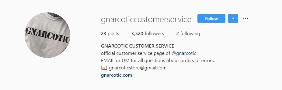 Not only does Gnarcotic have a separate account, but the company also dedicates its bio section to customer service and provides visitors with various options on how to get in touch with the customer support team.Â