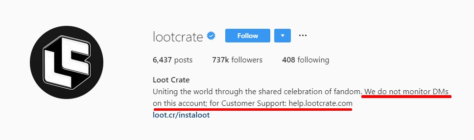 If you monitor direct messages and comments, you can encourage your Instagram visitors to get in touch with you on the platform. But if you don’t provide customer service on Instagram, it’s a good idea to set up a live chat and promote it on social media, just like Loot Crate did it: