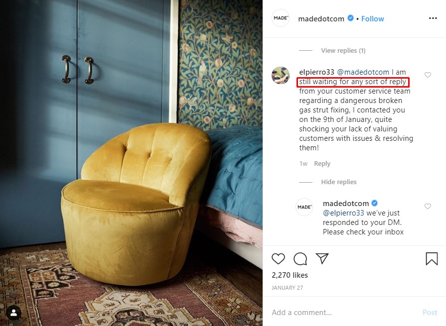 Since customers can leave comments, reply to Instagram Stories, and slide into direct messages, it’s important to be all ears. For example, the following example illustrates the importance of proactive customer service for Made.com:Â