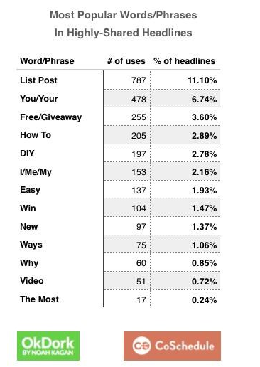 - The most popular words in highly shared headlines are “list post”, “you/your,” “free/giveaway,” and “how to”. (OkDork by Noah Kagan)
