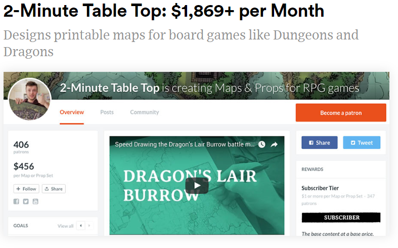 One example of a company making money on Patreon is 2-Minute Table Top. According to Gaps list of the biggest Patreon earners, this outfit designs printable maps for board games, like Dungeons and Dragons. Created in the 80s, D and D still has its ardent supporters. Many of them are willing to pay for these printable maps, each one custom-designed. According to the list, 2-Minute Table Top rakes in an average of $1,869 per month. That’s not too shabby as a secondary income source.