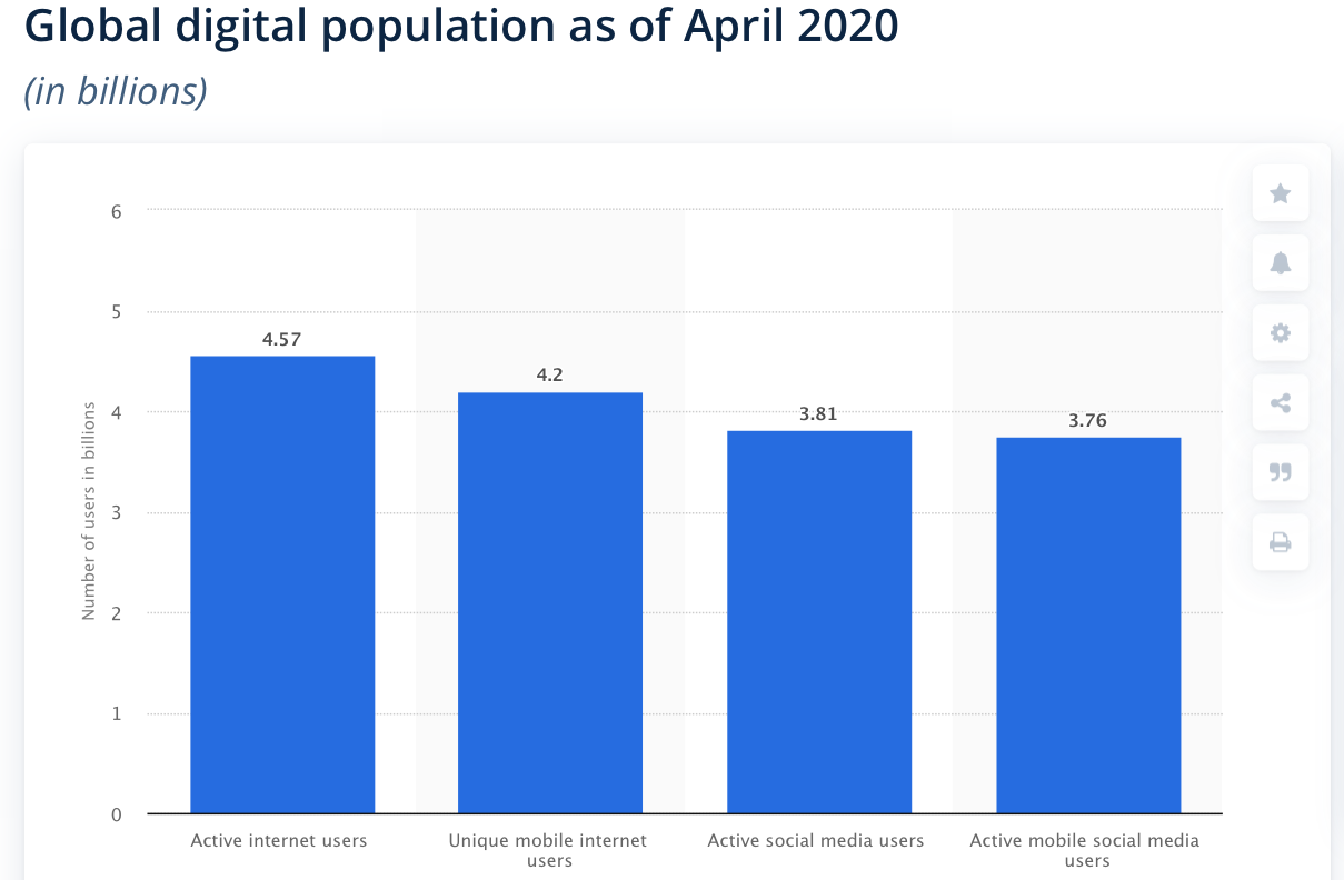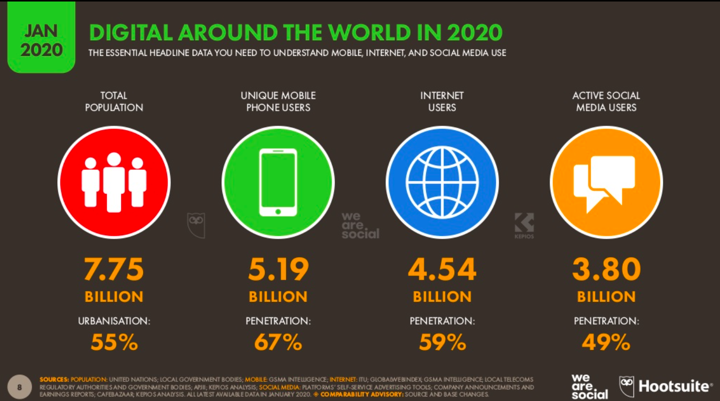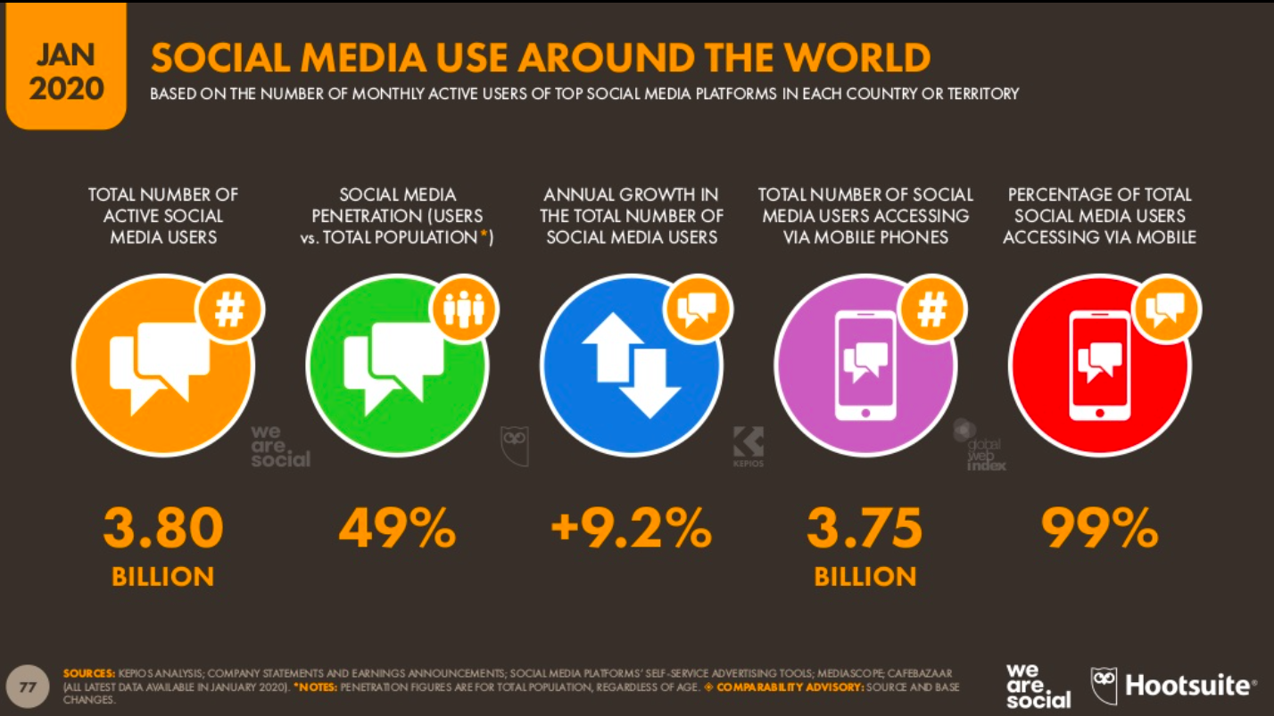 According to the Digital 2020 reports published by We Are Social in partnership with Hootsuite, there are 4.5 billion active Internet users today, with 3.8 billion of them using social media. Going a bit deeper, we will find out that on average, these people had 7.6 social media accounts and spent 142 minutes a day on social media back in 2019.Â