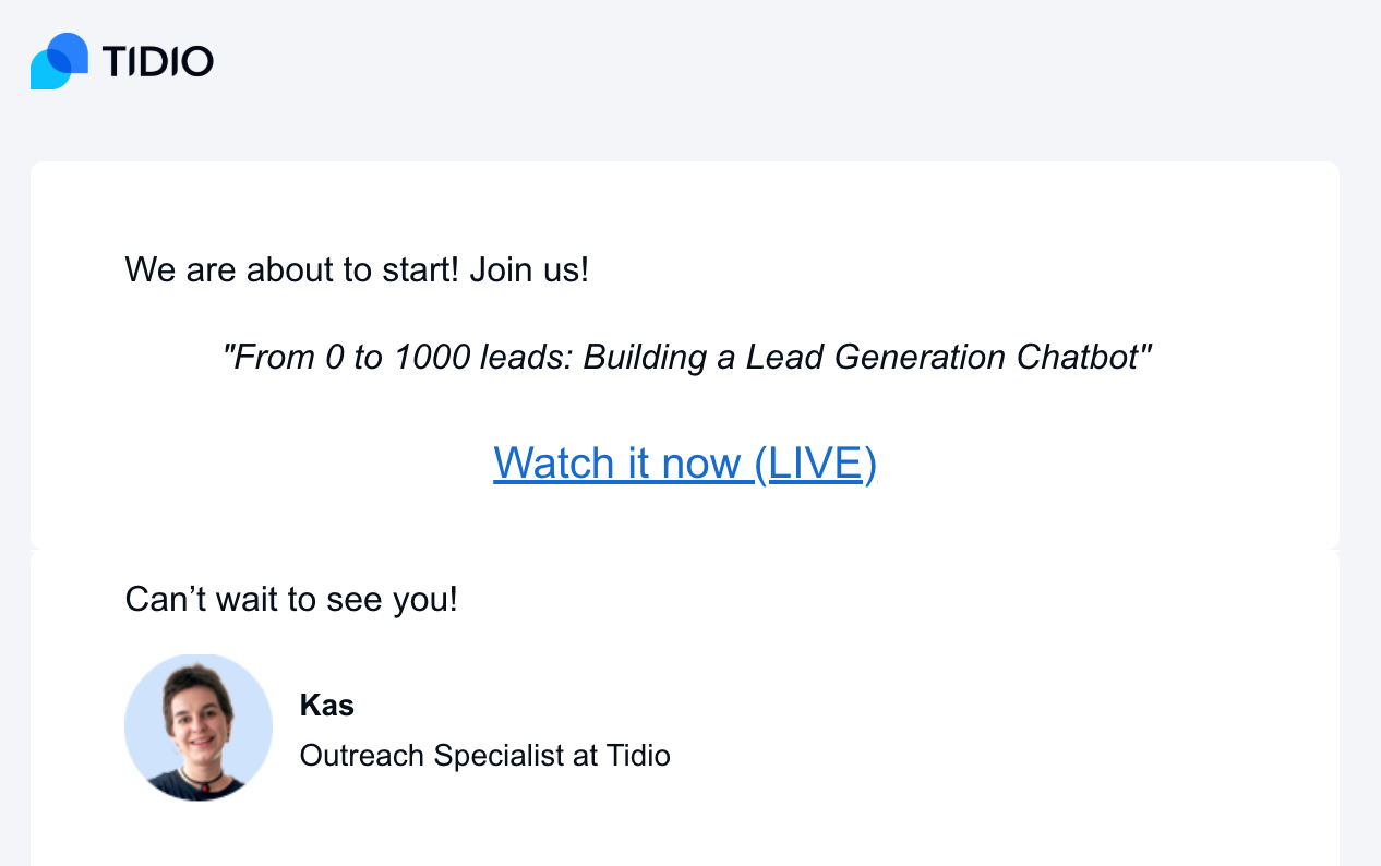 Like this one from Tidio, notifying that a webinar about chatbots is about to begin.