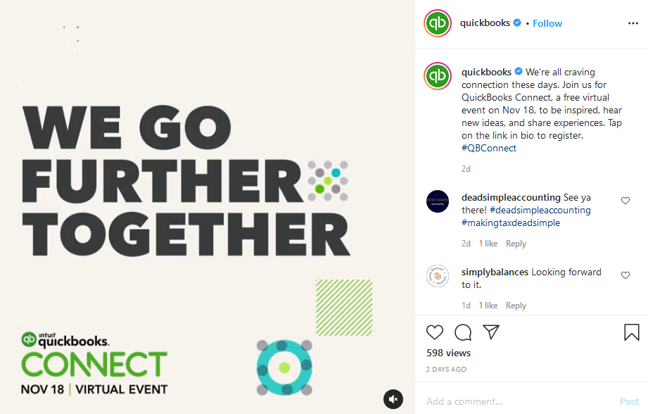 Recently, QuickBooks by Intuit announced a virtual event on its Instagram account. Even though the event is a month away, they can get people talking about it through the post. As you can see in the screenshot below, they also used an event-specific hashtag for their post.