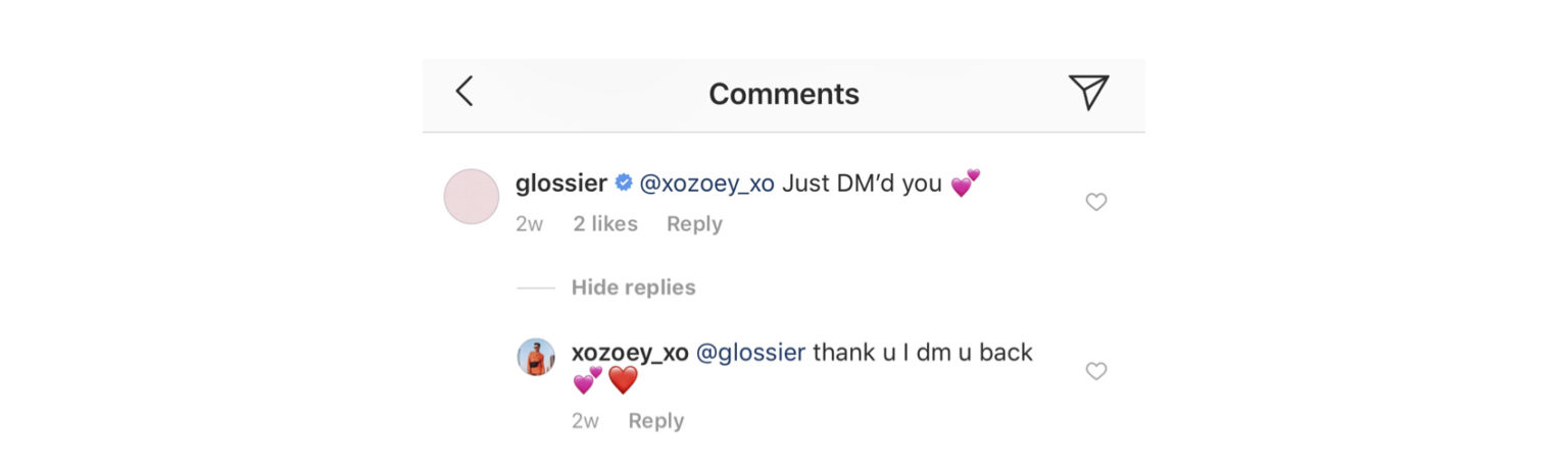 Here is an example of how the beauty brand, Glossier, handles customer inquiries on Instagram by direct messaging the customer: