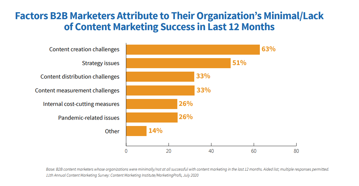 Moreover, marketers with low content marketing success in 2020 said that it was due to content creation challenges (63%) and strategy issues (51%), followed by challenges in content distribution and measurement.