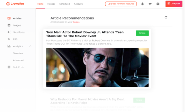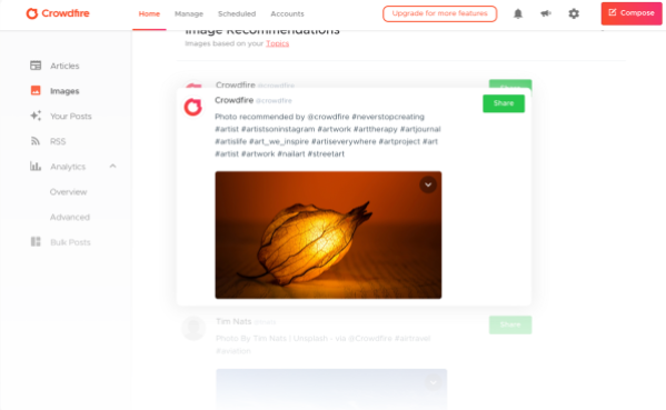 The platform gives users one crucial advantage — it curates images. You no longer have to worry about creating separate posts for Twitter and Instagram. Crowdfire suggests pictures you can use for your posts and tailors them to match your social channels.