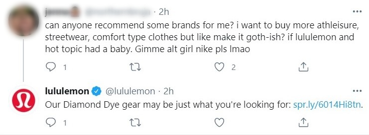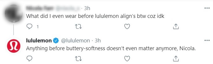 In this conversation, Lululemon simply acknowledges the compliment they’ve received from a customer in a fun and personalised way. It’s also another response to a brand mention that doesn’t use a handle or a hashtag.