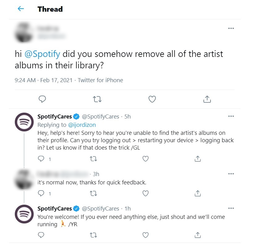 In the below example, Spotify solves the customer’s query without using response templates or canned messages. Their team members even sign off with their initials, providing another personalised touch.