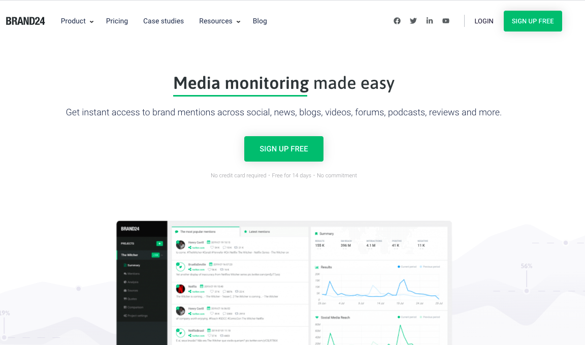Brand24 is a budget-friendly social media monitoring platform. The tool tracks keywords across different social media platforms, including Facebook, Instagram, Twitter, TikTok, YouTube, and Twitch. Based on the mentions, Brand24 calculates social media reach, influence score, the share of voice, and monitors hashtag performance.