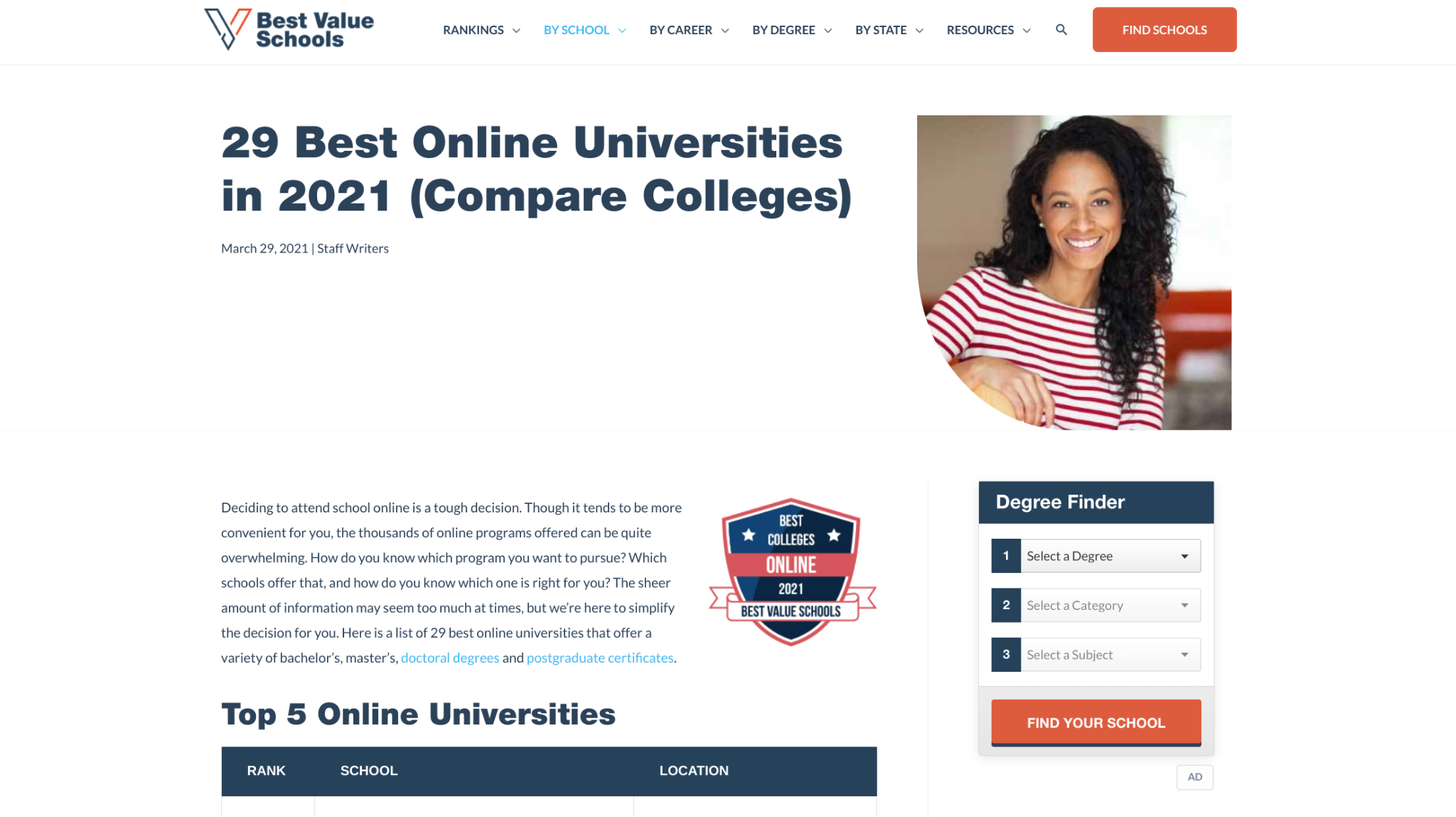 Last but not least, Best Value Schools offers helpful content, such as their round-up of the best online universities. They outline costs, program information, and more. Think about how helpful this type of content would be to a family with several kids! They have round-ups for all sorts of different subsections, like online universities, MBA programs, and more, too. If someone found one of these articles helpful, they might come back to the site the next time they or a loved one is looking for their next step in education. This is how loyalty is forged.