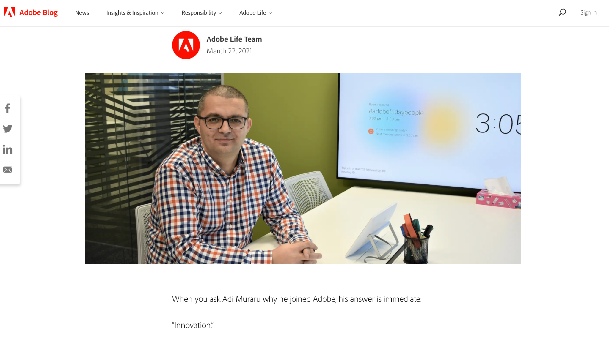 Adobe Life, the blog featuring the day-to-day work of Adobe, does this well across the board. Take a look at their post about a new employee, Adi Muraru. They outline his motivations for joining the company, his career goals, and more. By introducing their readers to the team at Adobe, they show their human side and build loyalty.