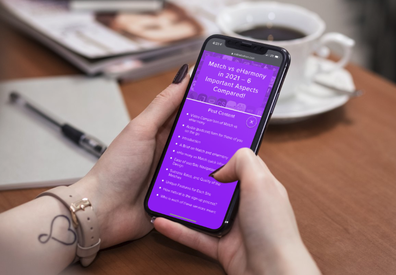 Online For Love, a website that discusses the ins and outs of various dating apps, has a comparison piece on Match vs. eHarmony that is very easy to read and navigate on mobile.