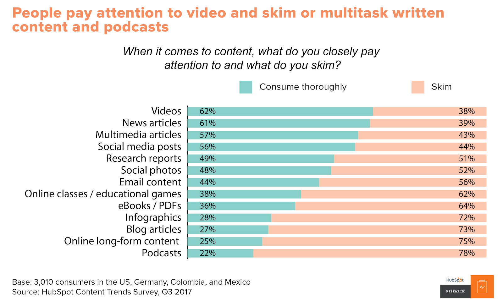 According to research shared by HubSpot, people pay attention to videos and multitask when consuming written content and podcasts.