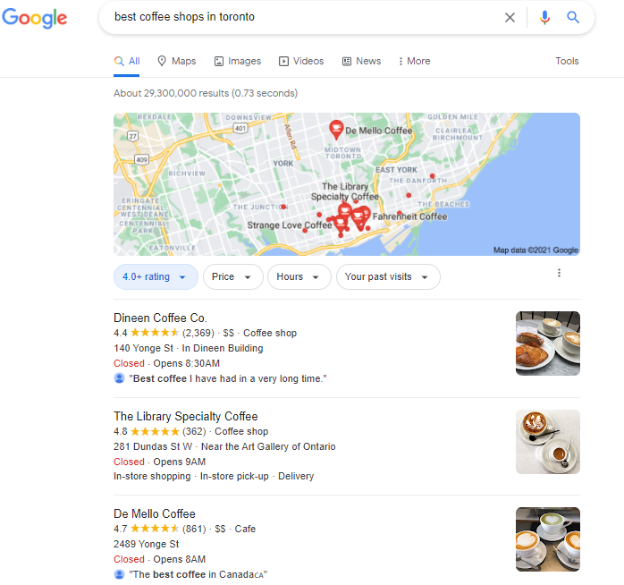 For instance, say you’re new in Toronto and craving some coffee, you’ll go to Google and search for the best coffee shops there. No brainer.Â