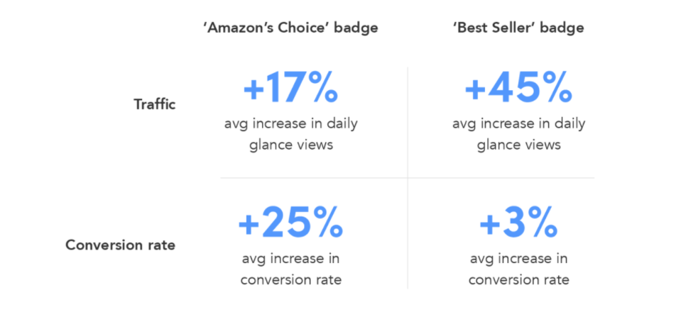 Statistics show that the products with “Amazon choice” and “bestseller” badges get a +25% and +3% increase in conversion rate, respectively.Â