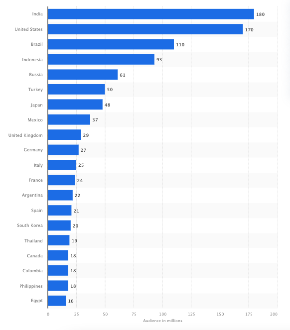 Research shows that millions of people around the world are actively using Instagram. This starts with India with an audience size of 180 million users, the US with 170 million users, and Brazil with 110 million users.